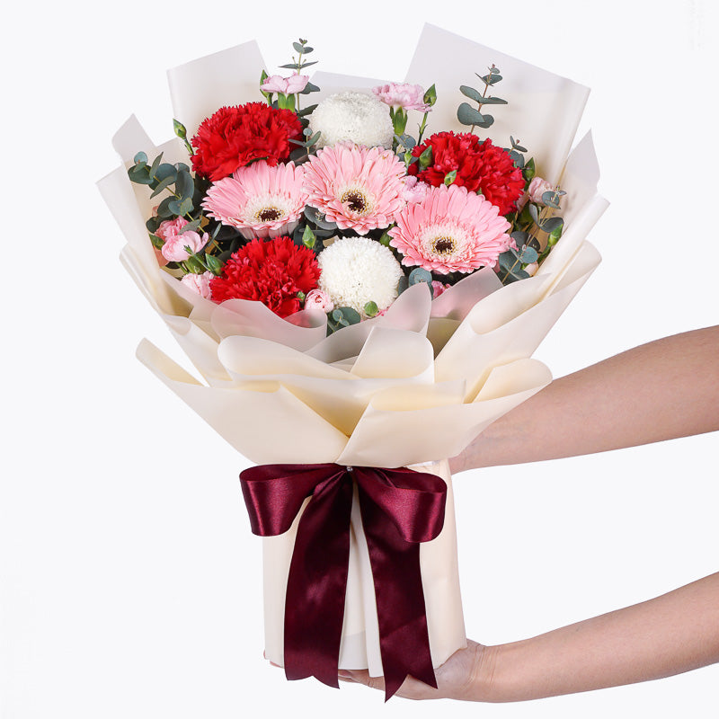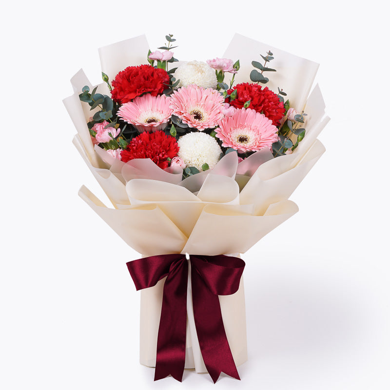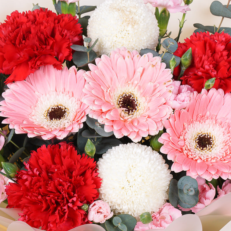 Red Carnation (3 stalks), Light Pink Carnation Spray (2 stalks), Light Pink Gerbera (3 stalks), White Ping Pong (2 stalks), Eucalyptus Leaves