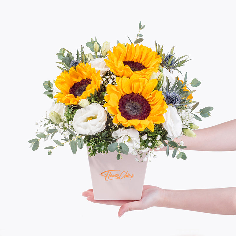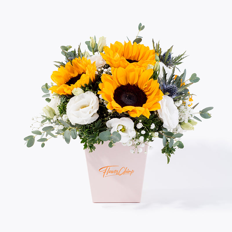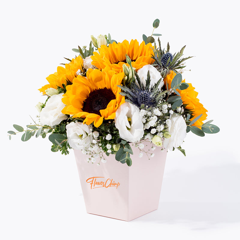 Yellow Sunflower (5 Stalks), White Eustoma (3 Stalks), Blue Eryngium, White Baby Breath, Eucalyptus Leaves
