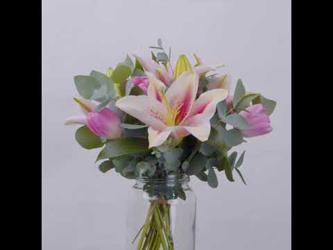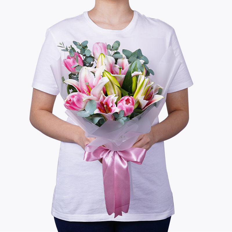 Pink Lily (2 Stalks), Pink Tulip (5 Stalks), Eucalyptus Leaves