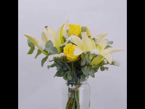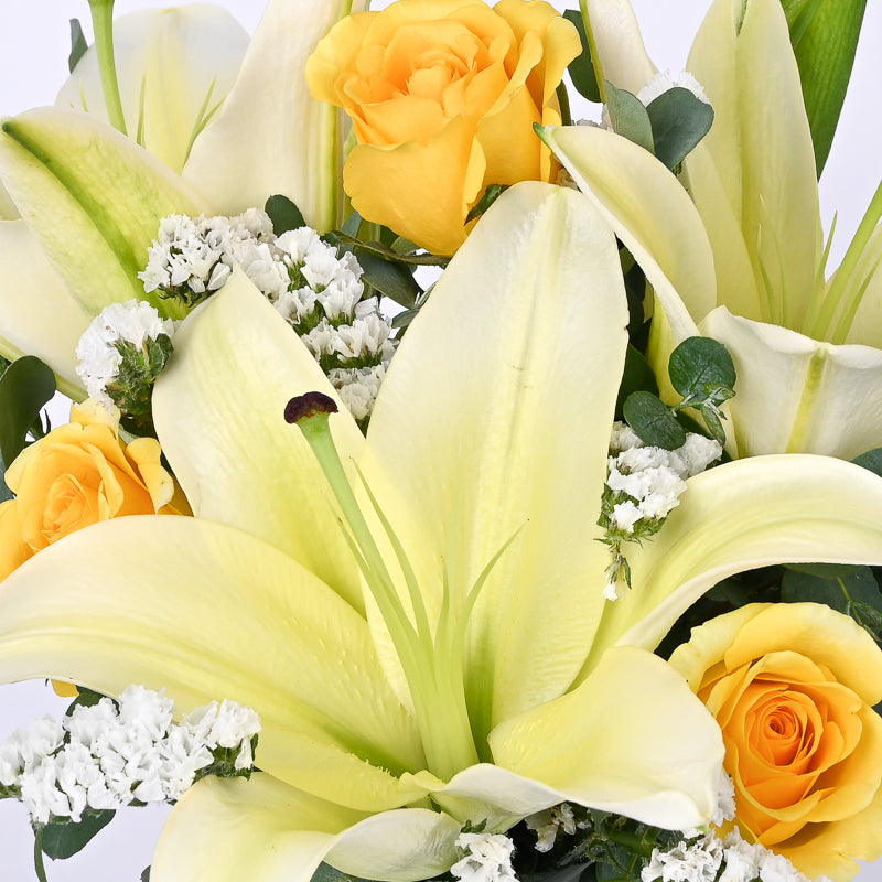 Yellow Lily (1 Stalk), Yellow Rose (3 Stalks), White Statice (1 Stalk), Eucalyptus Leaves