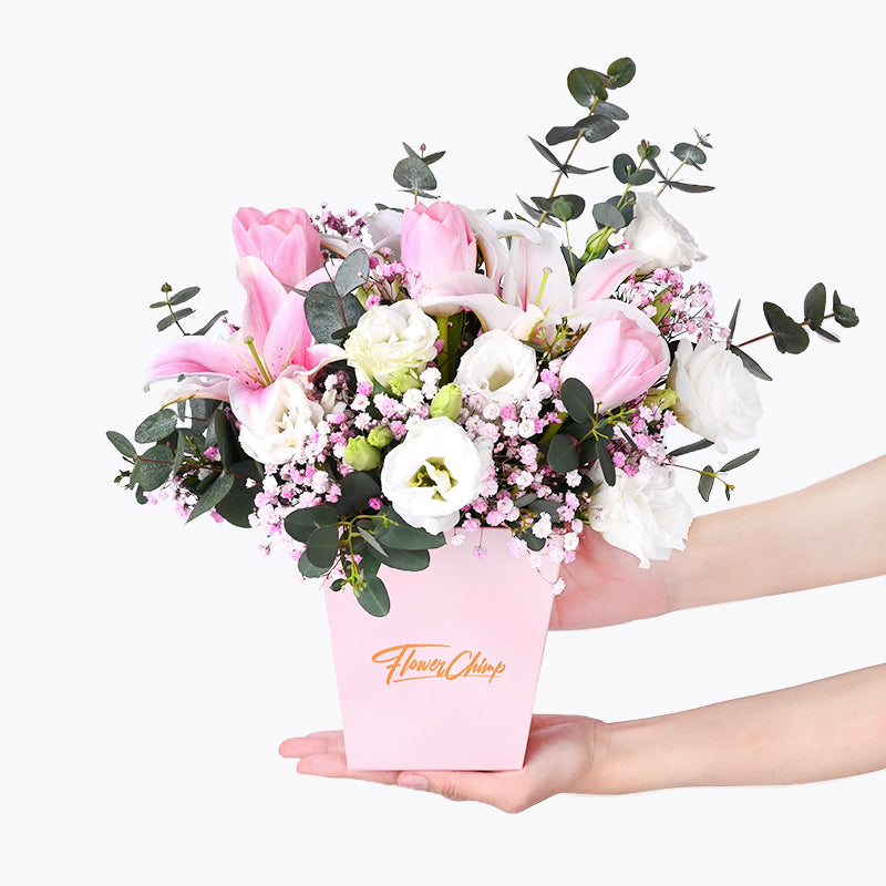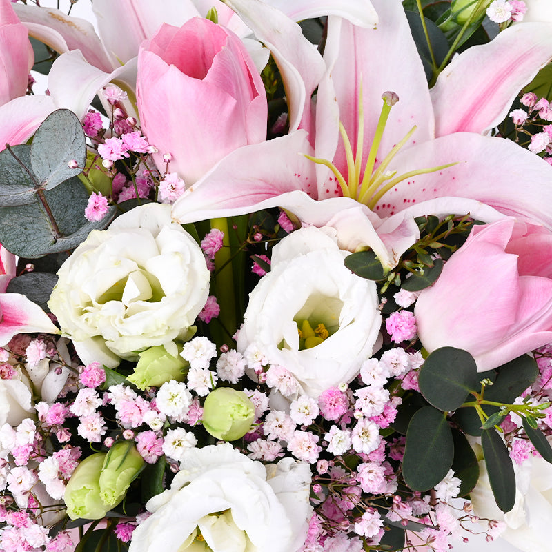Light Pink Tulip (3 Stalks), Pink Lily (1 Stalk), White Eustoma (2 Stalks), Eucalyptus Leaves, White Baby Breath