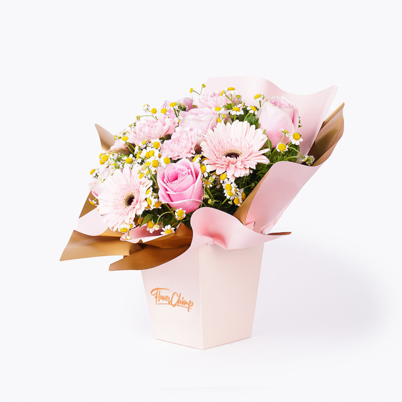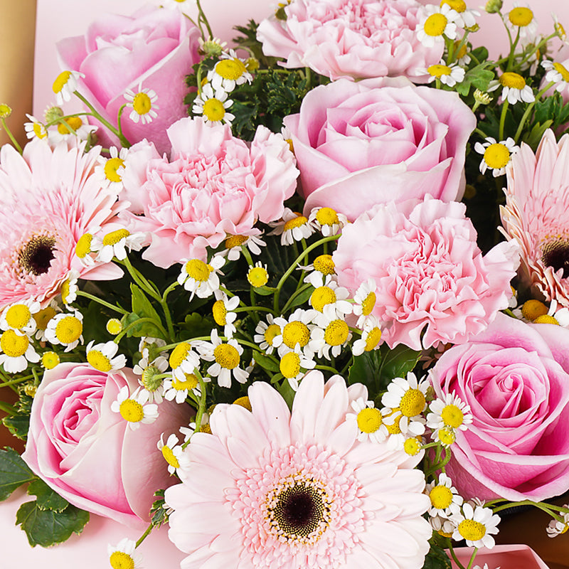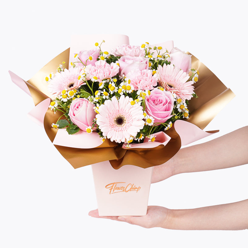 Pink Gerbera (3 Stalks), Pink Roses (5 Stalks), Pink Carnation (3 Stalks), Chamomile (3 Stalks)