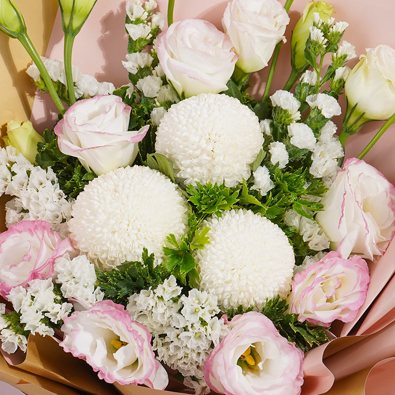 Standard: White Ping Pong (3 Stalks), Two-toned Pink Eustoma (2 Stalks), White Statice (1 Stalk)