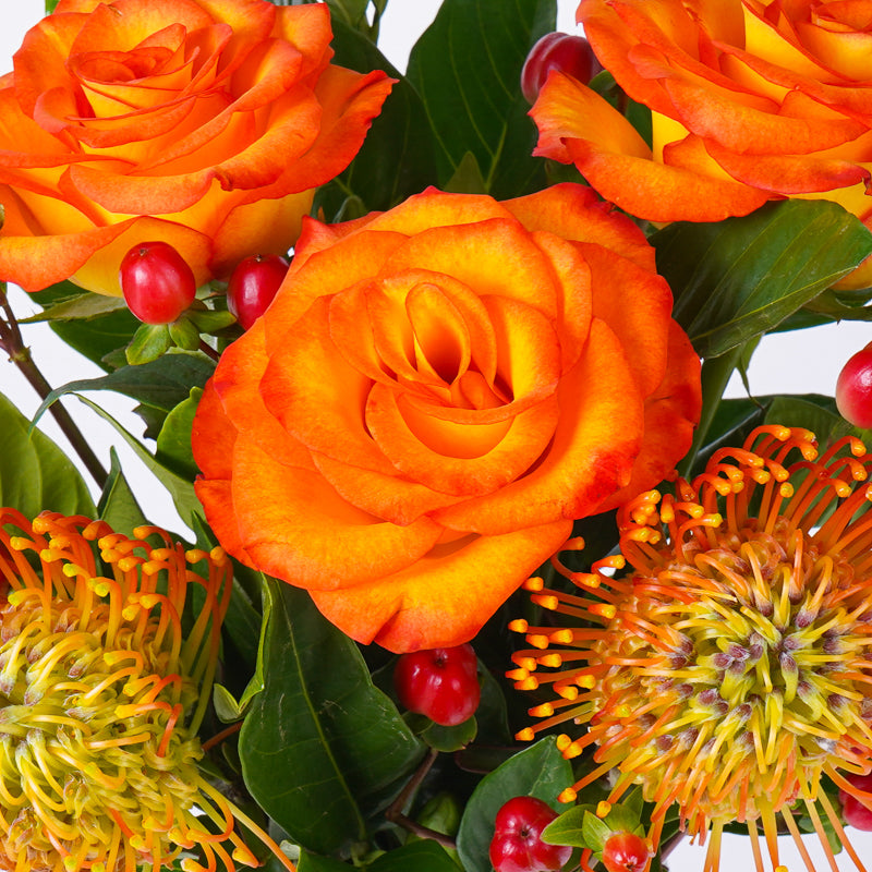 Orange Rose (3 Stalks), Orange Pincushion (2 Stalks), Red Berry (3 Stalks)