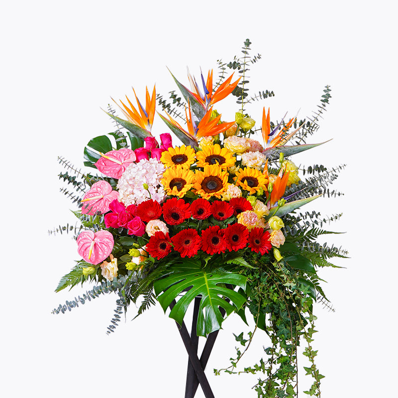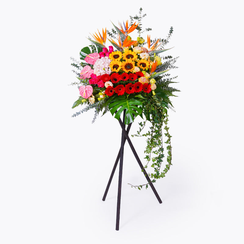 There's nothing like a grand opening stand made with fresh cut flowers to wring in the luck and prosperity and to send best wishes!