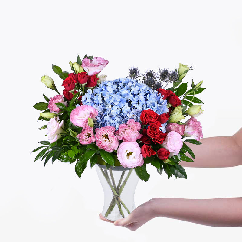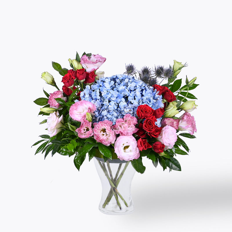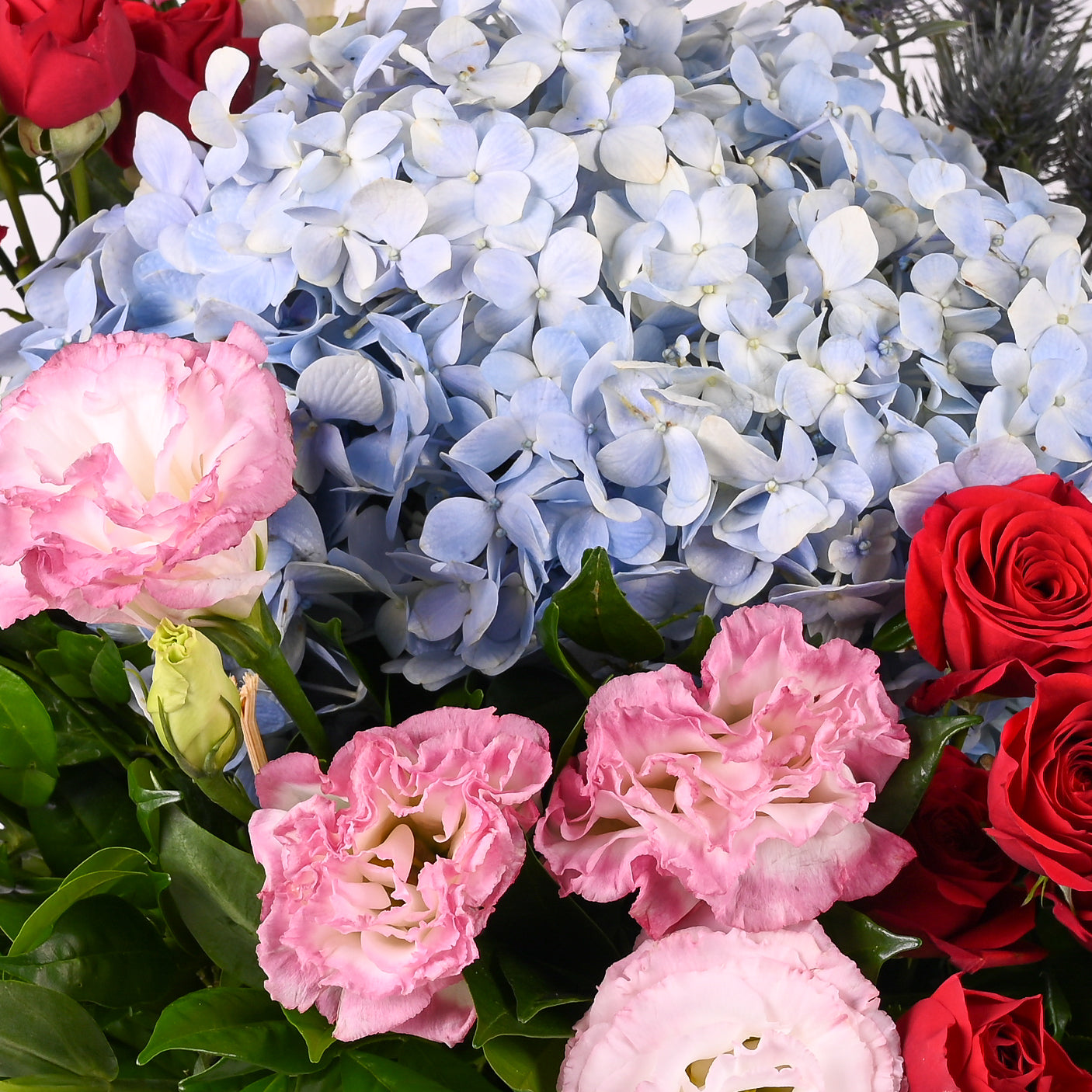 Light Blue Hydrangea (1 Stalk), Red Spray Rose (3 Stalks), Pink Eustoma (2 Stalks), Blue Eryngium