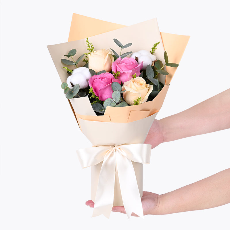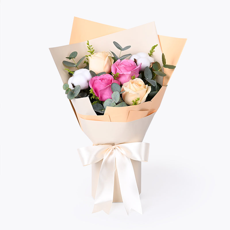 Champagne Rose (2 Stalks), Pink Rose (2 Stalks), White Cotton Flower (2 Stalks)
