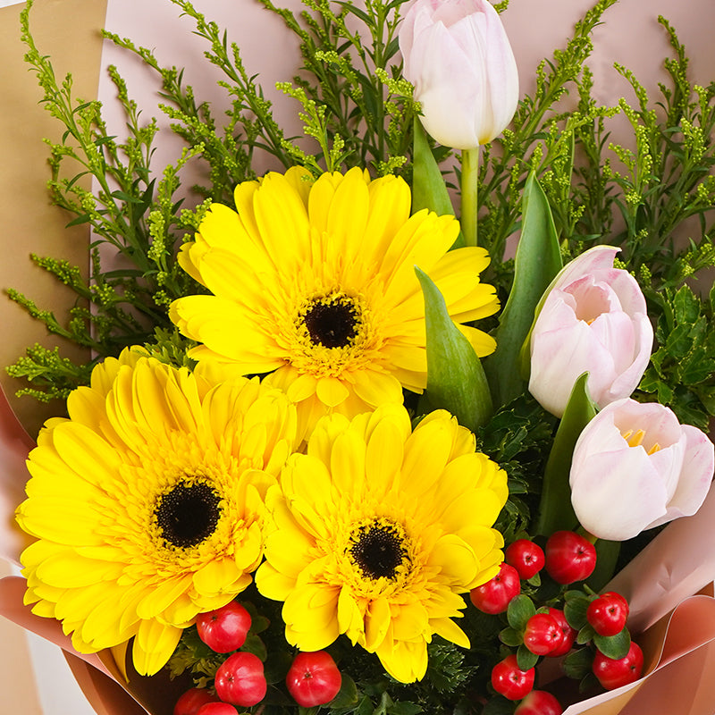 Soft whispers of pink, medleyed together with bursts of bright yellow. Our ethereal Cornelia bouquet brings you a mélange of premium tulips, sunshiny gerberas & red berries - perfect for making that special someone's day.