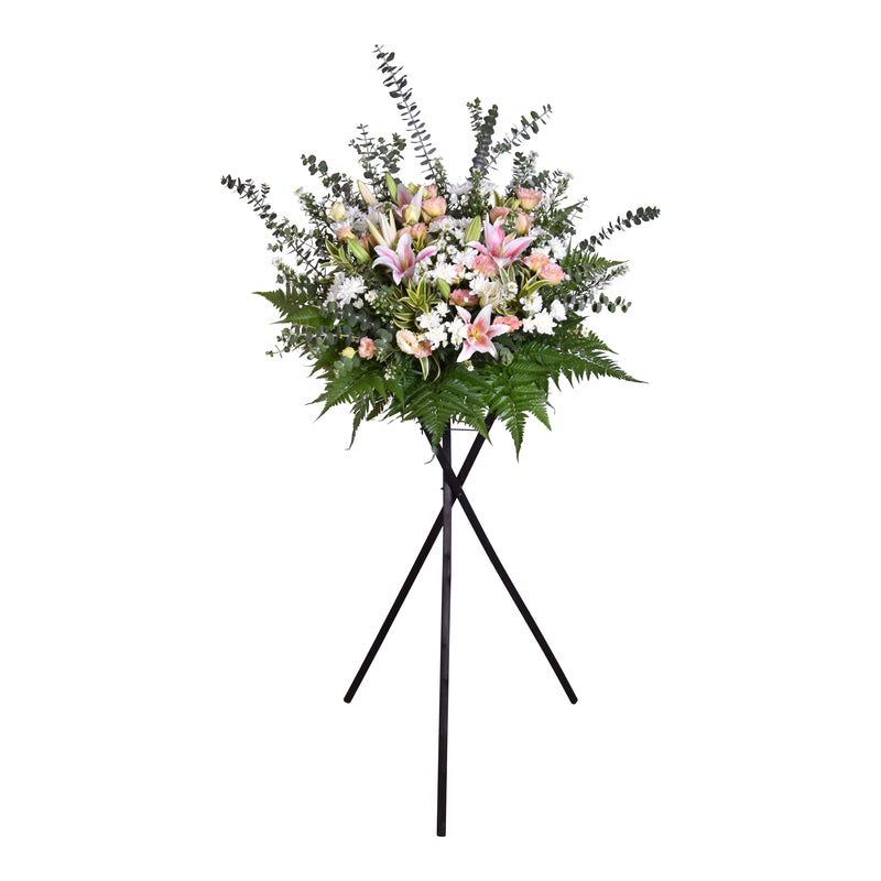 White Chrysanthemum (6 Stalks), Champagne Eustoma (5 Stalks), Pink Lily (4 Stalks), White Peacock, Yellow Song of India, Eucalyptus Leaves