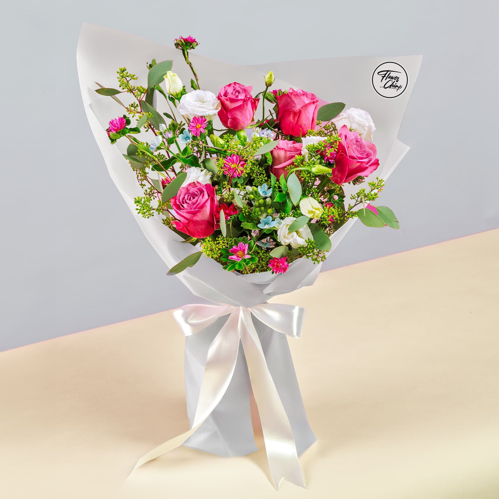 Purple Rose (5 Stalks), White Eustoma (2 Stalks), Dollar with Berry Eucalyptus (1 Stalk), Oxypelatum, Dark Pink Aster (1 Stalk)