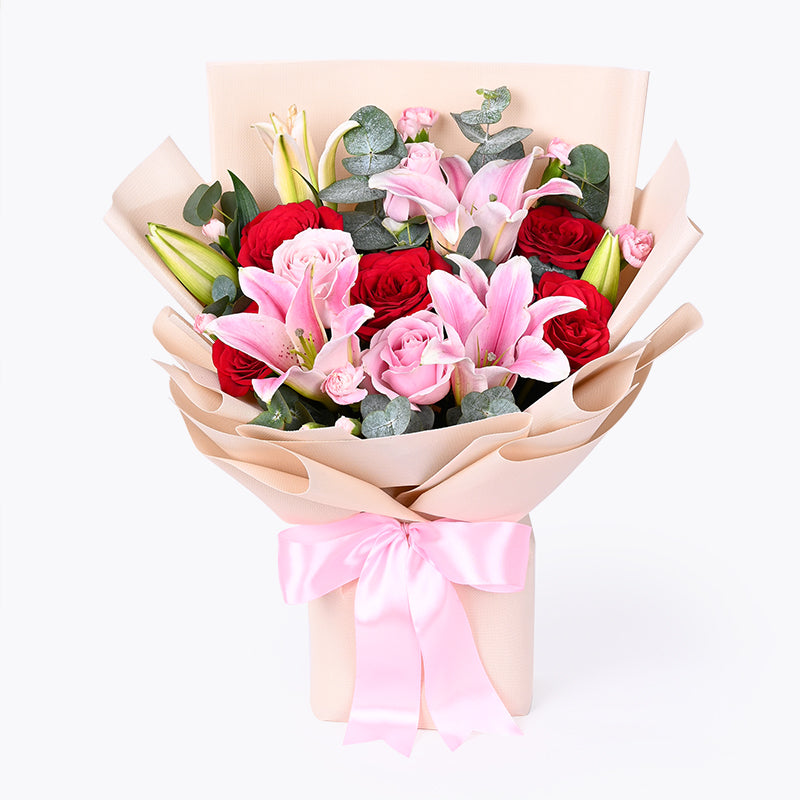 Red Roses (5 stalks), Pink Lily (2 Stalks), Pink Roses (3 Stalks), Pink Carnation Sprays (2 Stalks), Eucalyptus Leave