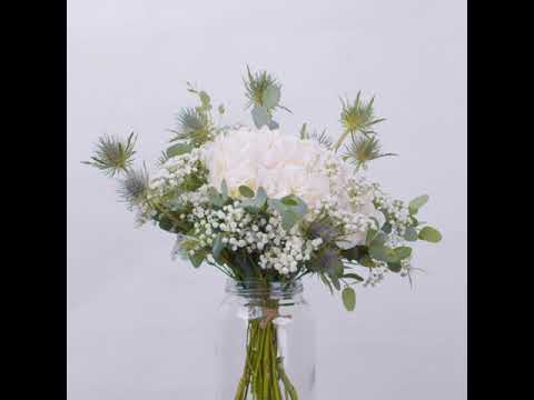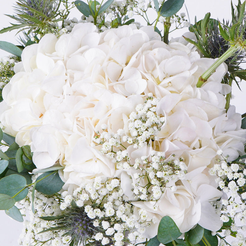White Hydrangea (1 Stalk), Blue Eryngium, White Baby Breath, Eucalyptus Leaves