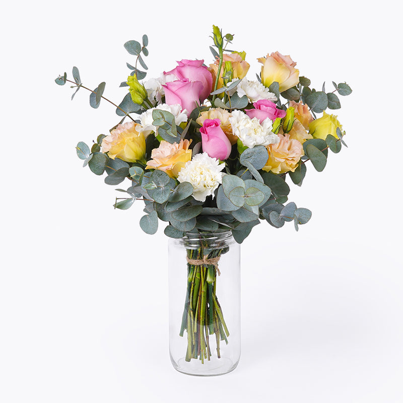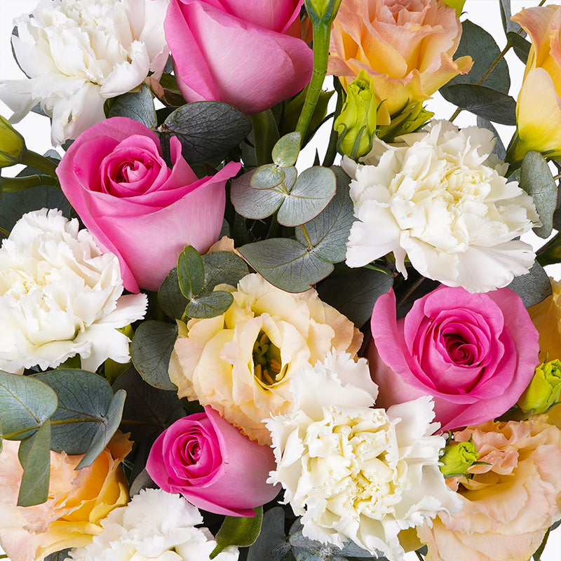 White Carnation (5 Stalks), Champagne Eustoma (3 Stalks), Pink Roses (4 Stalks), Eucalyptus Leaves