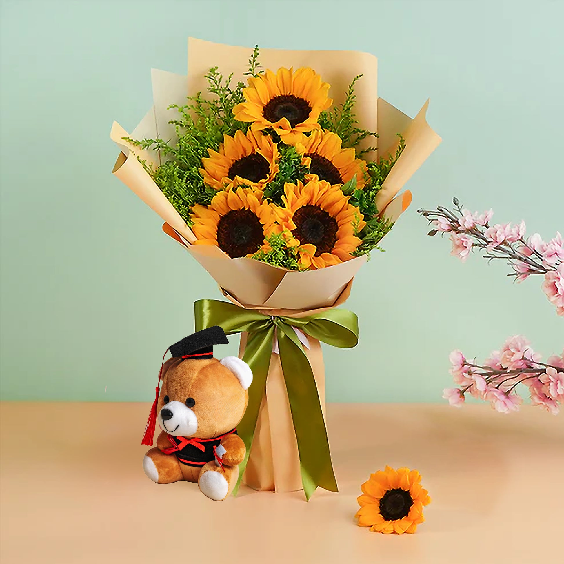 For the graduate who has gone above and beyond - a gift to celebrate all their Gleaming Success! This lovely graduation gift set brings you an adorable graduate teddy, along with our Bloomy Days sunflower bouquet. Perfect for that special someone, embarking on the journey towards their bright future.