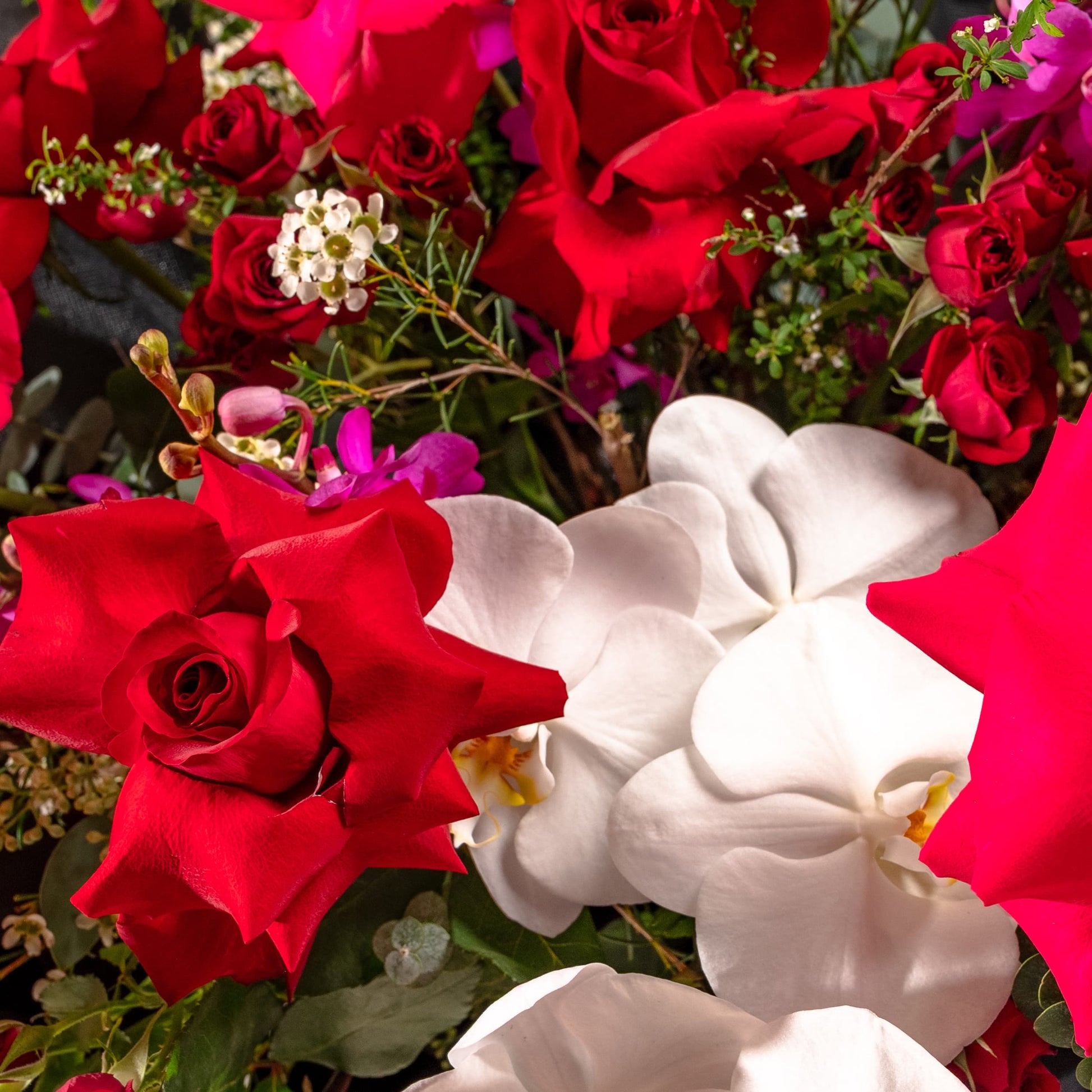 Red Premium Rose (6 Stalks), Shocking Pink Premium Rose (6 Stalks), Purple Makara (5 Stalks), Maroon Rose Spray (5 Stalks), White Snowflake/ Spirea (2 Stalks), Baby Blue Eucalyptus (1 Stalk), White Cut Phalaenopsis (1 Stalk)