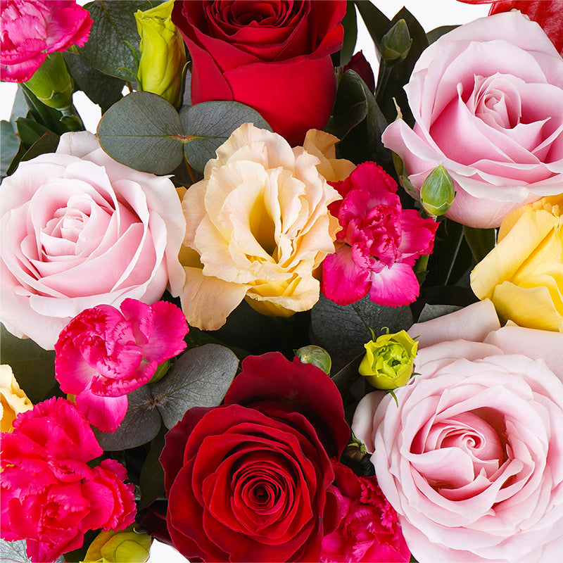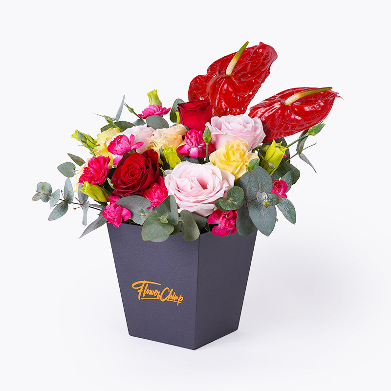 Red Roses (2 Stalks), Pink Roses (3 Stalks), Red Anthurium (2 Stalks), Pink Carnation Spray (1 Stalk), Champagne Eustoma (1 Stalk), Eucalyptus Leaves