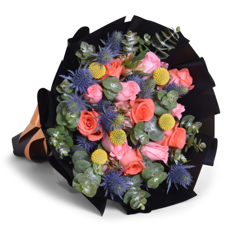 Orange Rose (6 Stalks), Pink Rose (6 Stalks), Orange Pink Alstroemeria (5 Stalks), Yellow Crespedia, Blue Eryngium, Eucalyptus Leaves