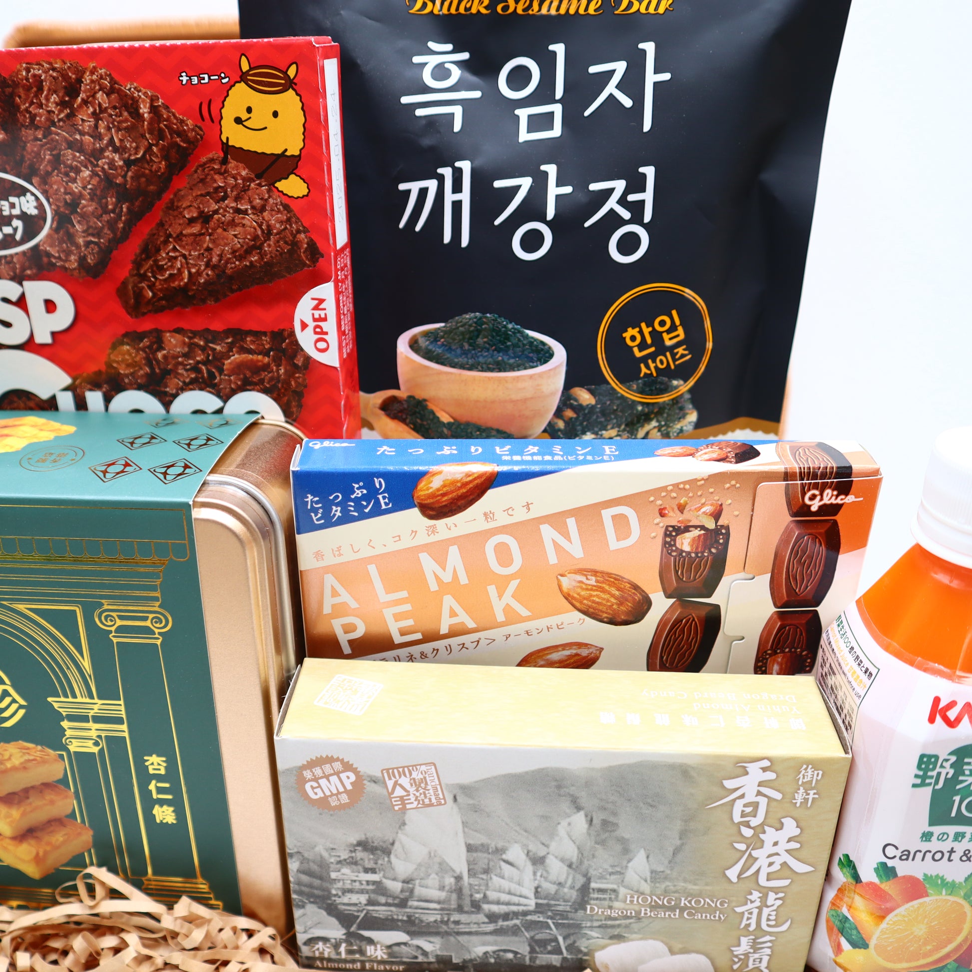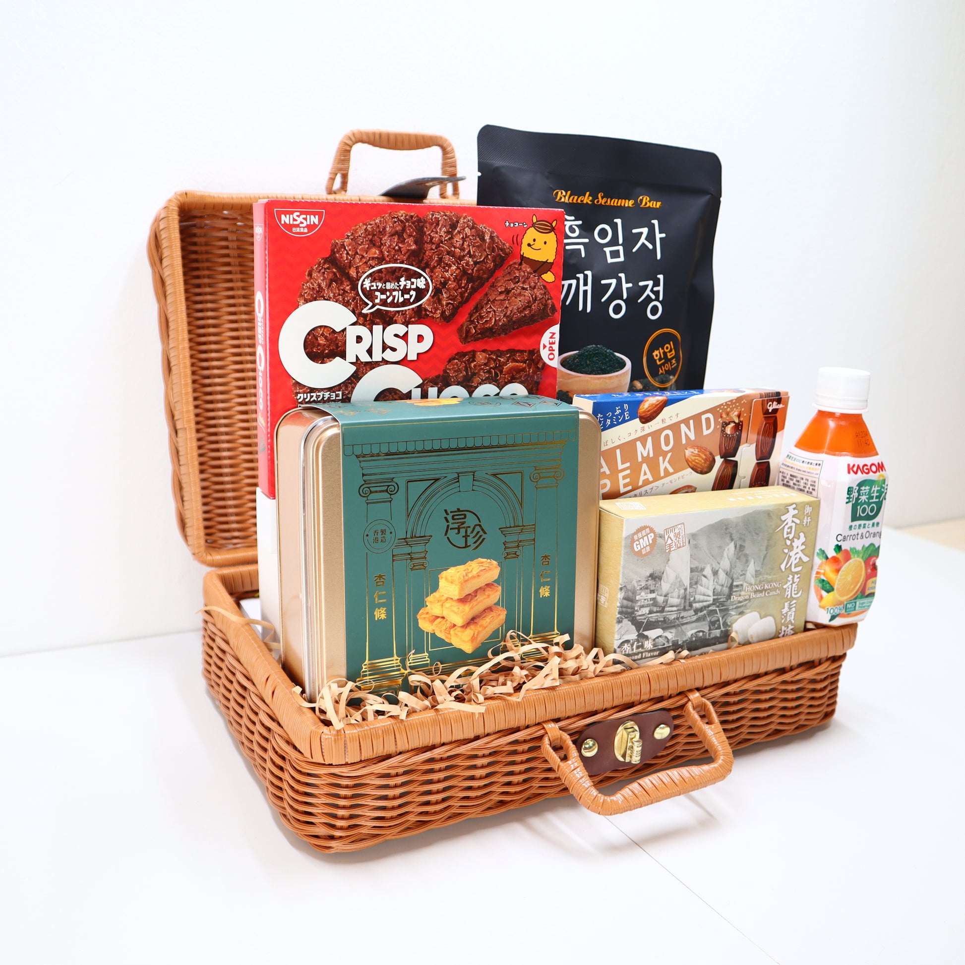 Brighten up their day with a unique and delicious gift. Our hamper features a vibrant assortment of snacks, including Kagome Mixed Carrot Juice, Shun Chun Almond Puff, Glico Almond Peak Choco, KM Sesame & Peanut Bar, Yu Hin Almond DB Candy, and Nissin Crisp Choco. It's the perfect blend of sweet and tangy, sure to make them smile.