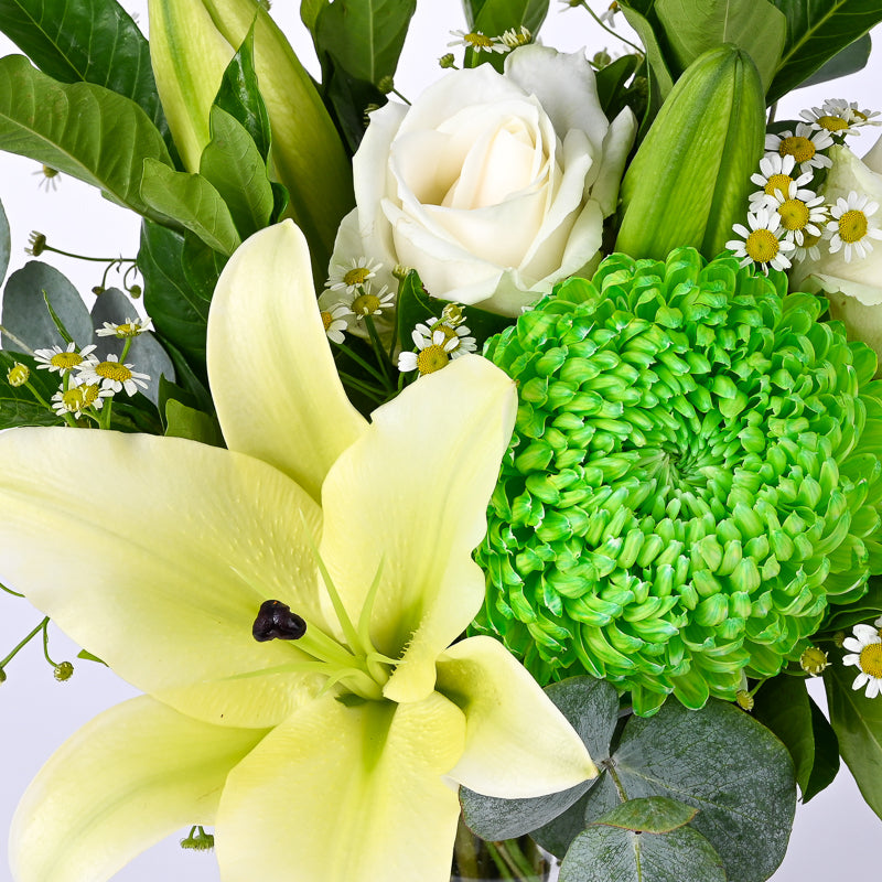 White Rose (2 Stalks), Yellow Lily (1 Stalk), Green Mum Net, White Chamomile, Eucalyptus Leaves