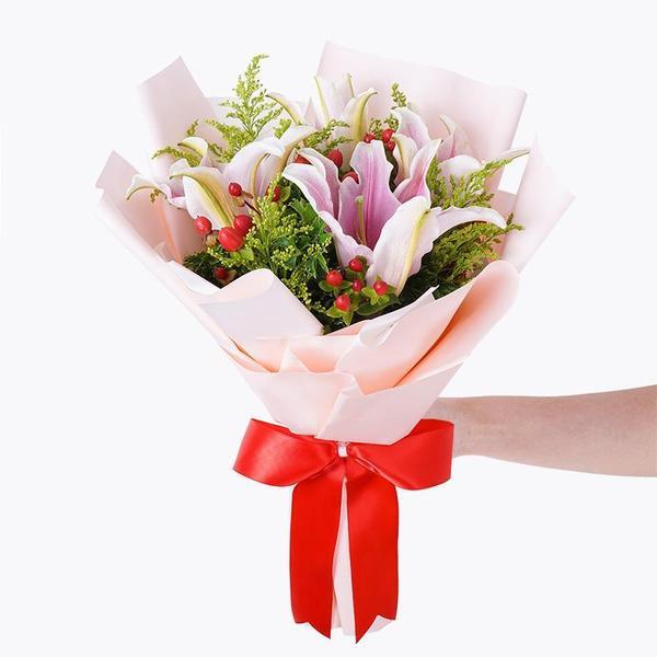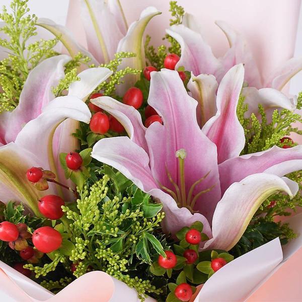 Beautiful pink lilies, decorated with red berries, peacock yellow, and tea leaves; our Lovely Lillian flower bouquet is a sweet gesture to make someone's day bright, blooming, and beautiful.