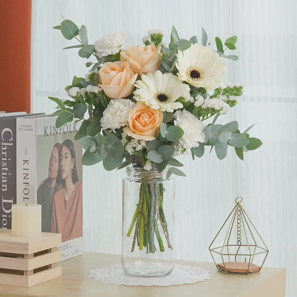 Champagne Rose (3 Stalks), White Gerbera (2 Stalks), White Carnation (3 Stalks), White Statice, Eucalyptus Leaves