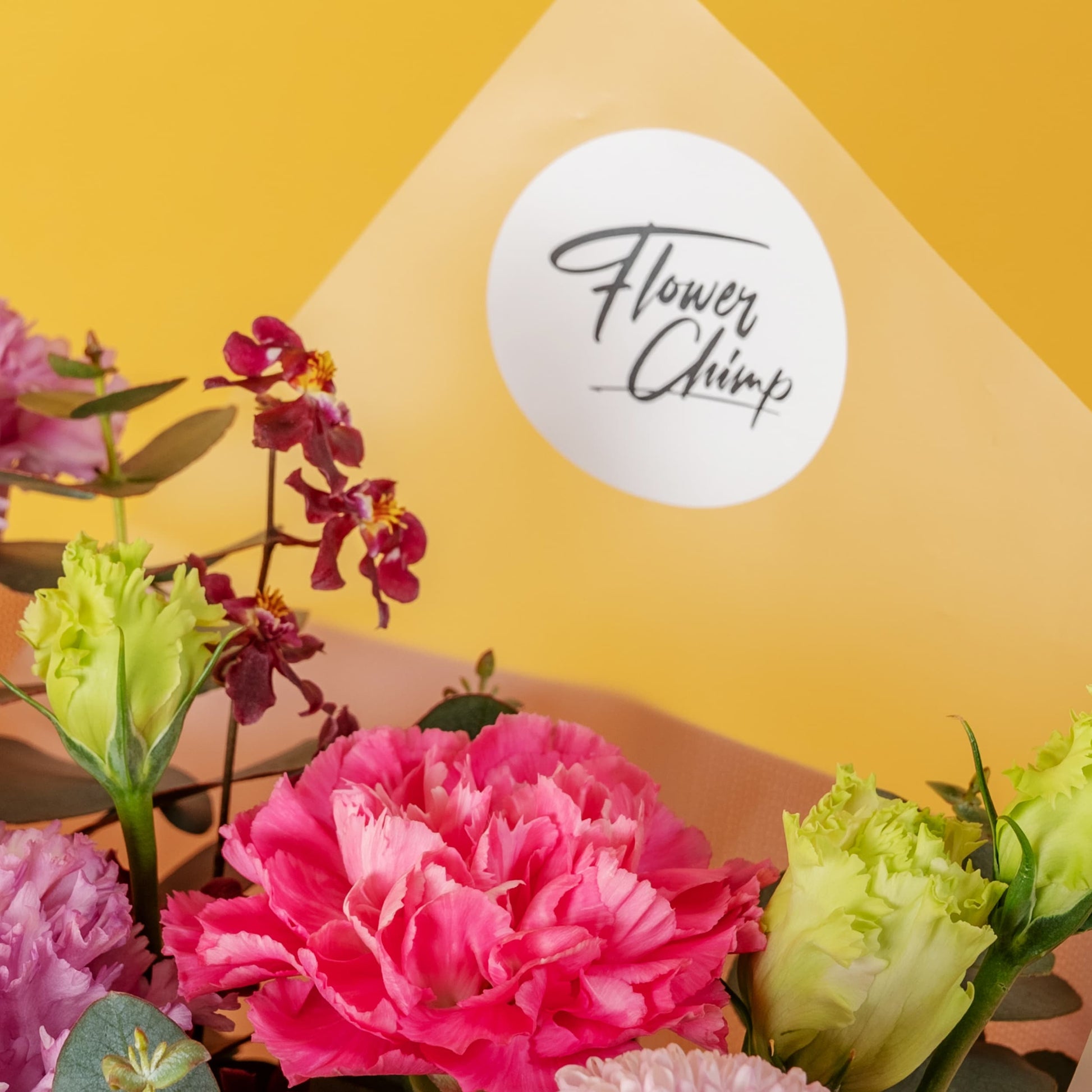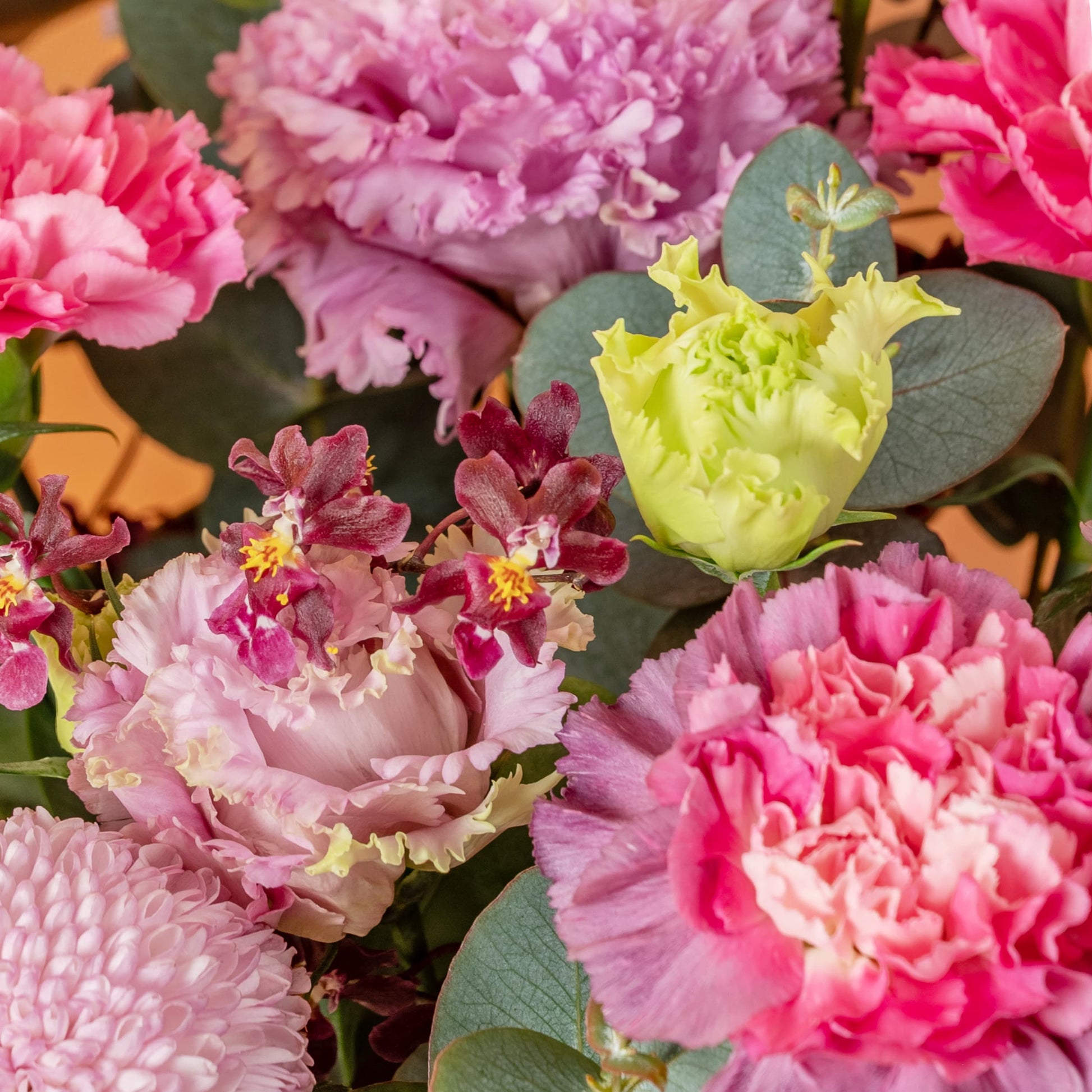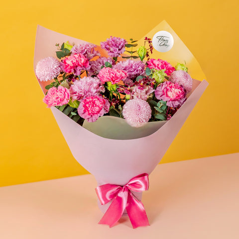 This beautiful Mother's Day bouquet brings together medium pink carnations and two-tone purple-pink carnations as its star blooms, their gentle contrast creating a depth that is sweet at first glance, quietly striking on closer look. Light pink ping pong blooms add soft, rounded fullness, while delicate light purple eustoma lifts the arrangement with an airy elegance. Wrapped in soft pink-purple with complementary foliage and finishing blooms, Lyra arrives as beautiful as the woman it's meant for.