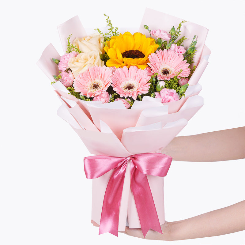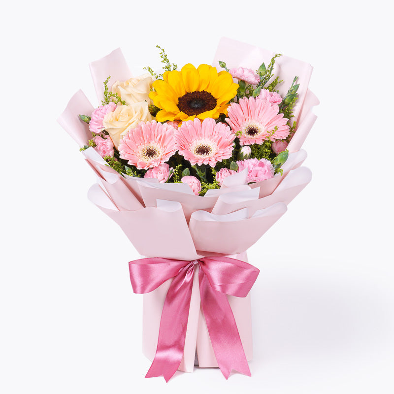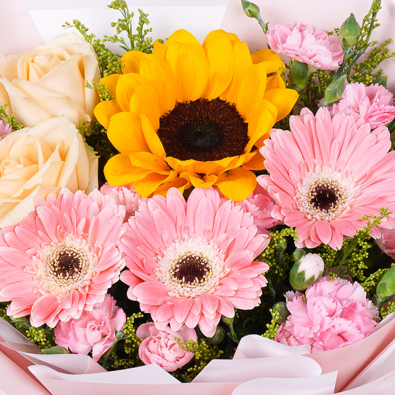 Light Pink Carnation Spray (2 Stalks), Light Pink Gerbera (3 Stalks), Champagne Rose (2 Stalks), Yellow Sunflower (1 Stalk), Yellow Peacock