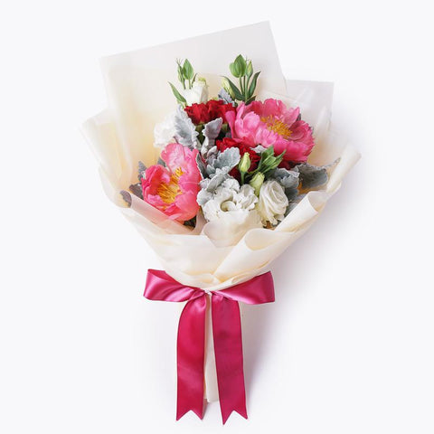 Every special occasion comes with the most wonderful memories and our Margot flower bouquet will truly flourish all your celebrations; no matter the occasion. Decked with beautiful coral peonies, a spray of red roses, dusty leaves and white eustomas, leave the sweetest momento for your loved ones to always remember you by.