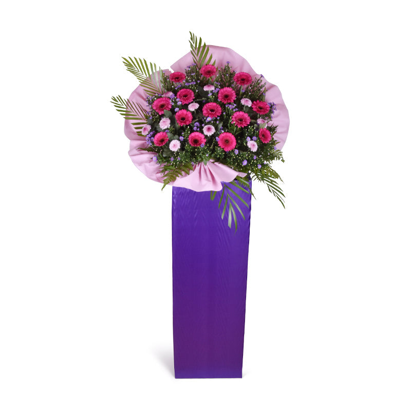 Shocking Pink Gerbera (15 stalks), Purple Ping Pong (10 stalks), Green Paku Leaf, Green Palm Leaf, Purple Peacock