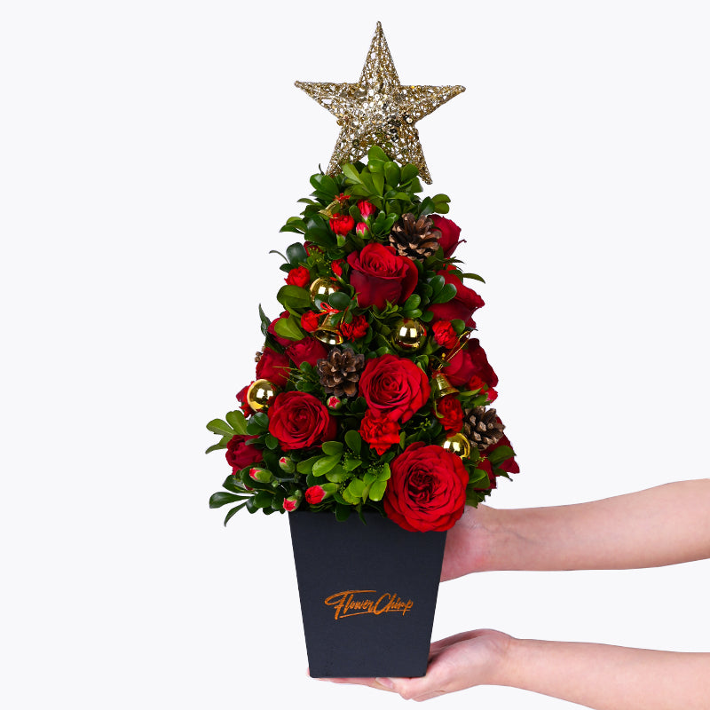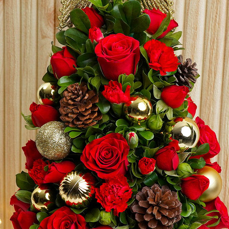 The marvelous Christmas tree - brimming with beautiful red roses, carnations, pinecones and golden ornaments - all topped off with a dazzling star! Send your loved ones the gift of a Christmas Miracle this holiday season, to make their festivities beautiful and bright.