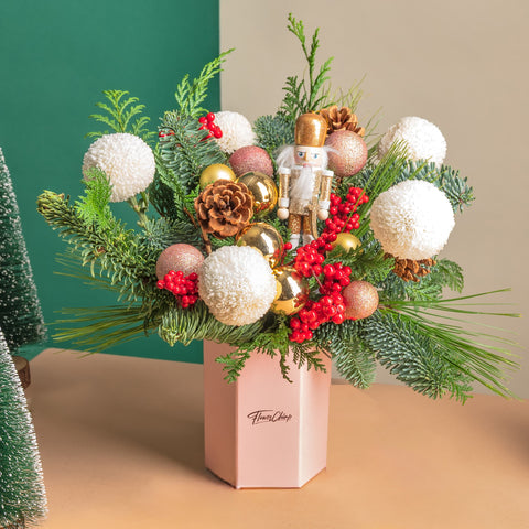 Watch the magic of Christmas come alive in this adorable flower box! Featuring pristine white roses and soft pink carnation sprays with festive red berries, rustic pine cones, and lush winter greenery. A charming miniature nutcracker stands guard alongside golden ornaments that add festive sparkle. This enchanting arrangement captures all the wonder of the holiday season, making it the perfect gift for bringing Christmas joy to someone special!