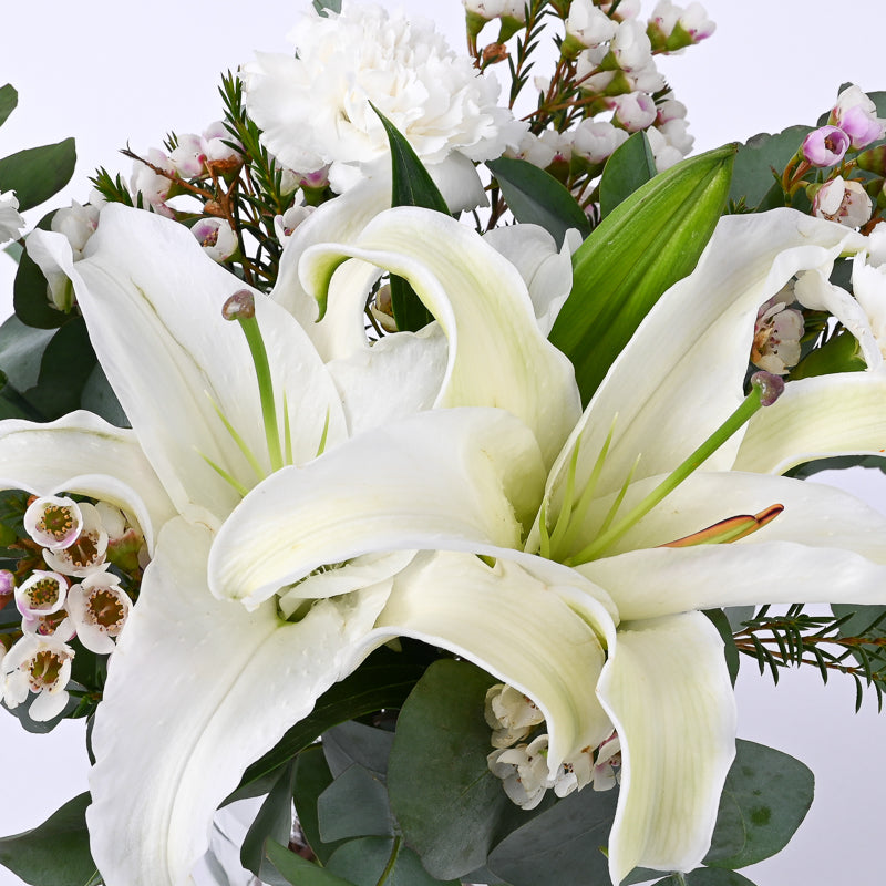 White Carnation (3 Stalk), White Lily (1 Stalk), White Wax Flower (3 Stalk), Eucalyptus Leaves