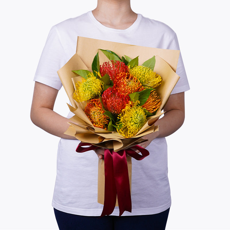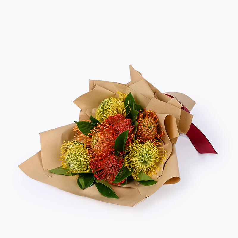 Red Pincushion (2 stalks), Yellow Pincushion (3 stalks), Orange Pincushion (3 stalks)