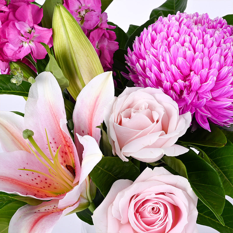 Maria Pink Rose (2 Stalks), Pink Lily (1 Stalk), Pink Mum Net (1 Stalk), Dark Pink Matthiolas (2 Stalks)