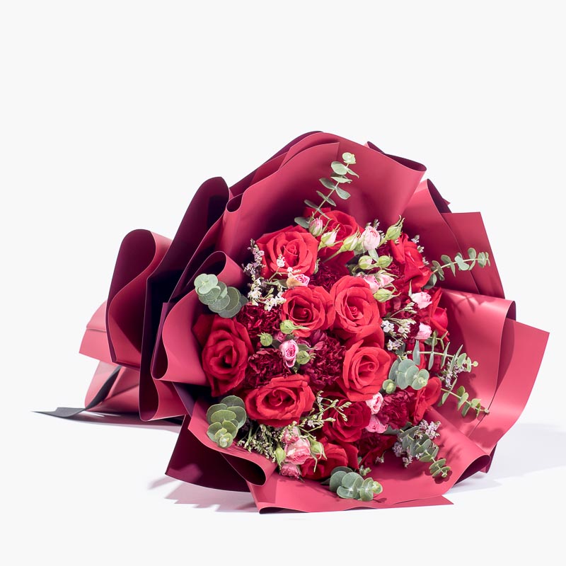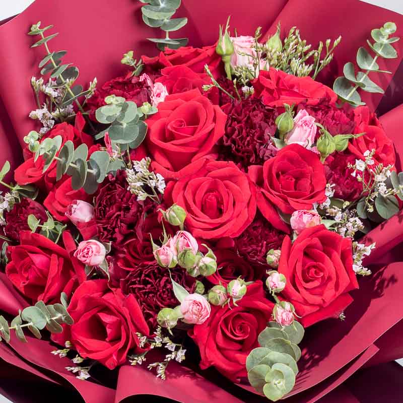 Red Roses (18 Stalks), Pink Spray Rose (4 Stalks), Maroon Carnation (10 Stalks), Pink Caspia, Eucalyptus Leaves