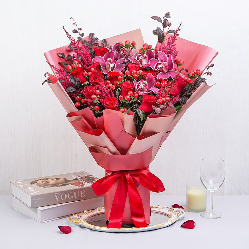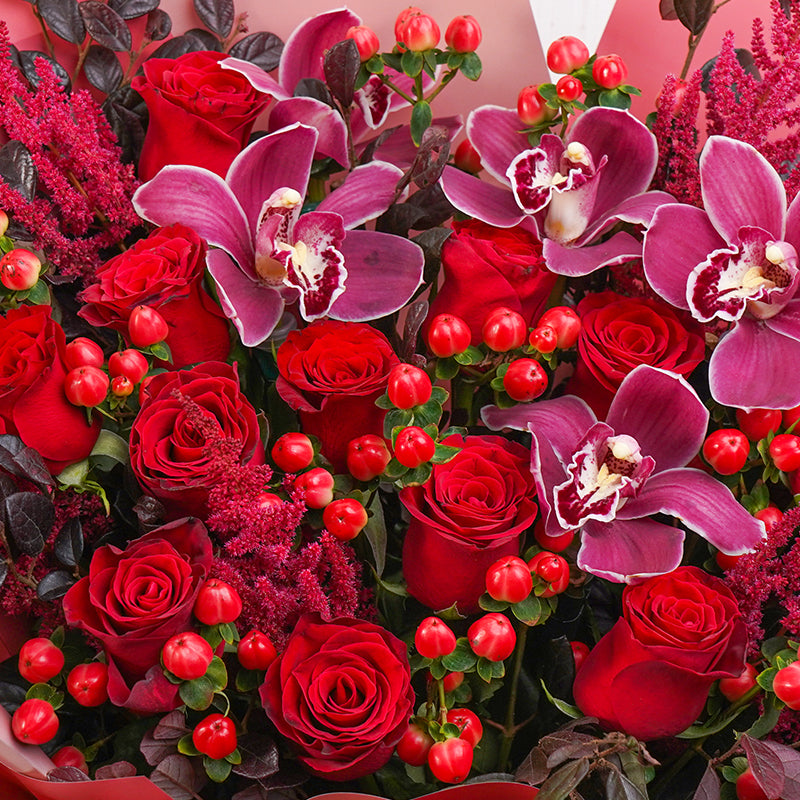 Red Rose (12 stalks), Cymbidium Maroon (5 stalks), Red leaf (5 stalks), Berry Red (3 stalks), Astilbe Shocking Pink (5 stalks)