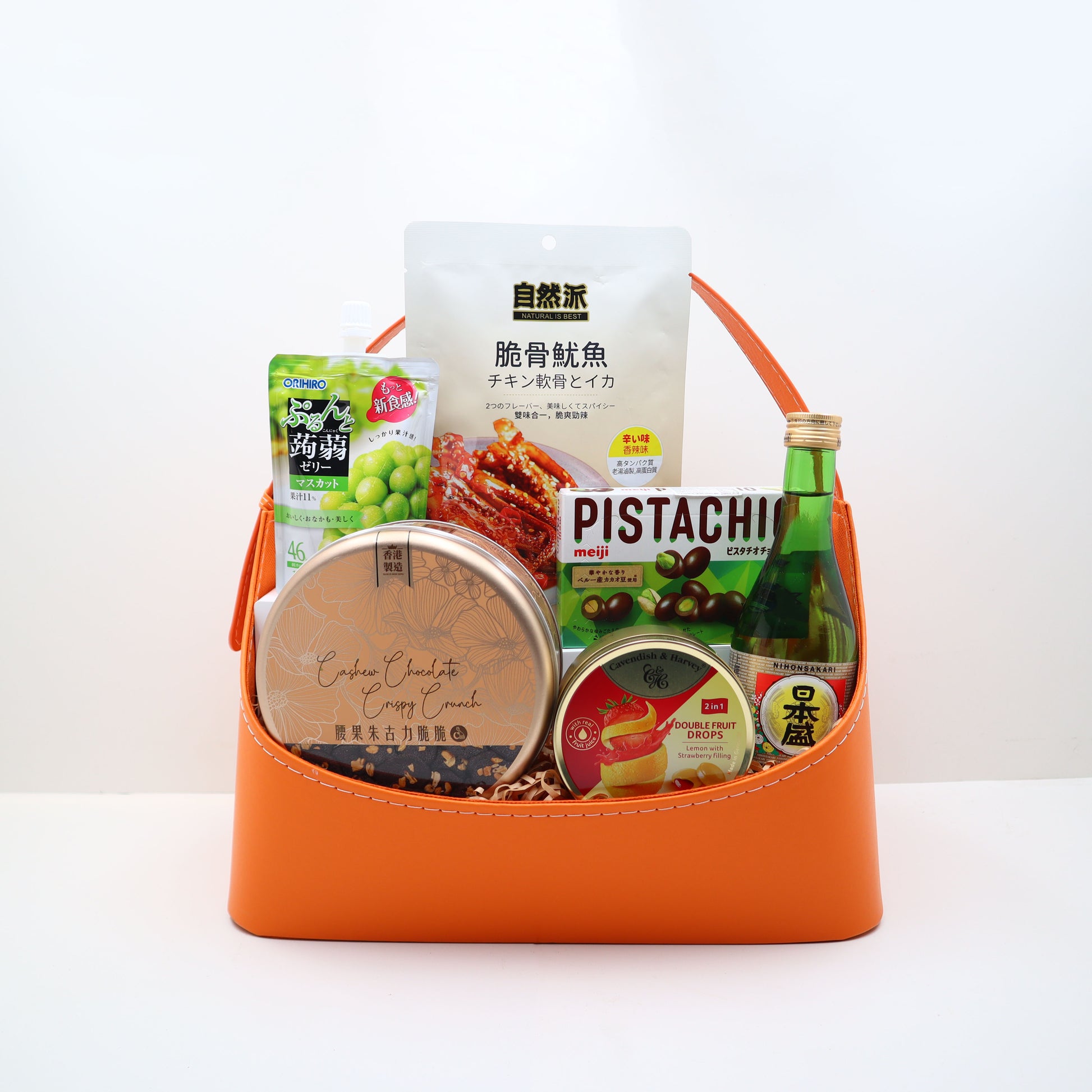 Give the gift of indulgence. Treat your loved one to a hamper filled with delicious treats like Nihonsakari Jousen, CM Bakery Cashew Crunch, Naturalisbest Squid, Orihiro Grape Jelly, Meiji Pistachio Chocolate, and Cavendish Lemon Strawberry Filling.