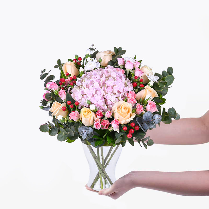 No matter if it’s for home or as a gift, our Sierra flower arrangement will surely impress! Contained in an elegant vase are stalks of beautiful flowers that exude warmth, such as light pink hydrangeas, champagne roses and light pink spray roses.