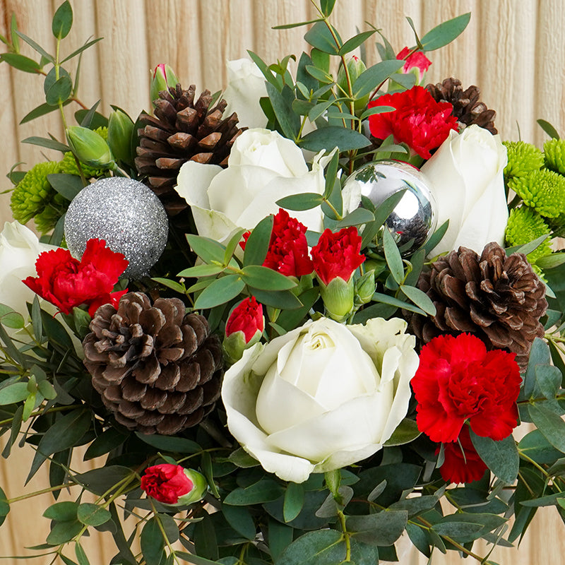 Snowy white roses and sprays of gorgeous red carnation flowers, decorated with festive pine cones and glimmering silver ornaments. Our Sleighbell flower vase is an arrangement that encapsulates the spirit of a white Christmas, truly the perfect gift for a holiday home!