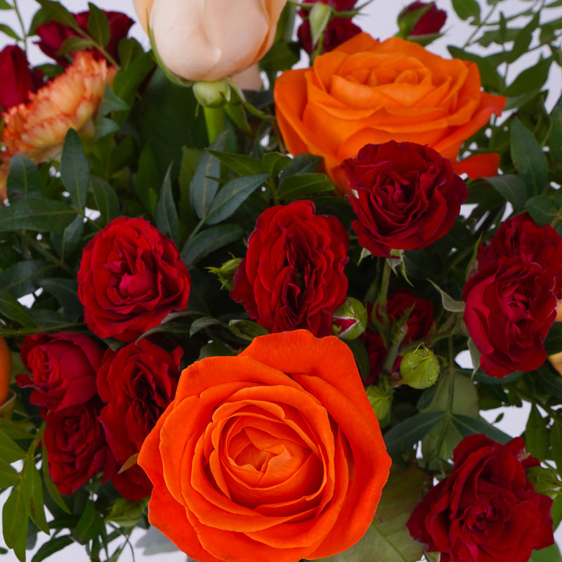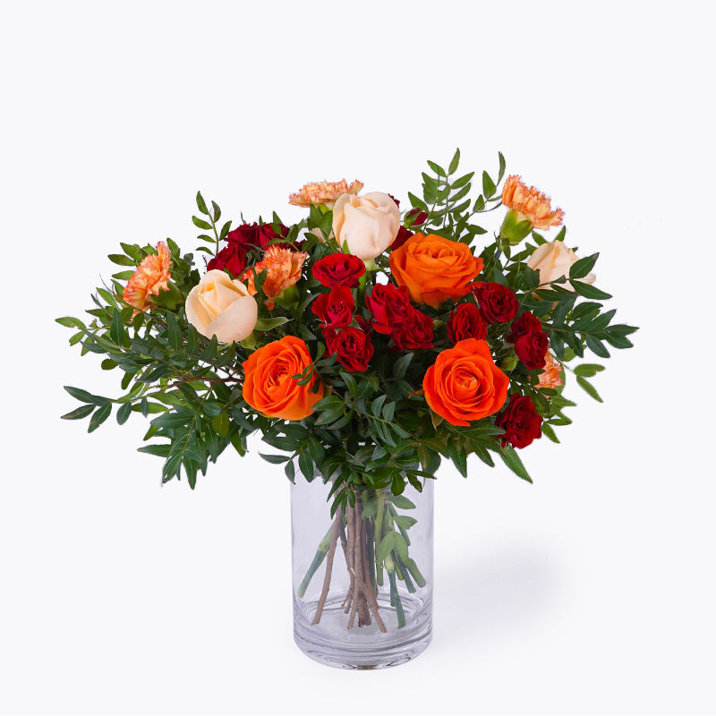 Yellow Carnation (5 Stalks), Champagne Rose (5 Stalks), Orange Rose (3 Stalks), Red Rose Spray (3Stalks), Green Pistacia Leaf