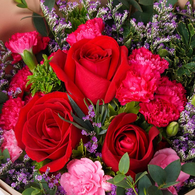 Red Roses (3 Stalks), Light Pink Carnation (3 Stalks), Shocking Pink Carnation Spray (1 Stalk), Purple Caspia, Eucalyptus Leaves