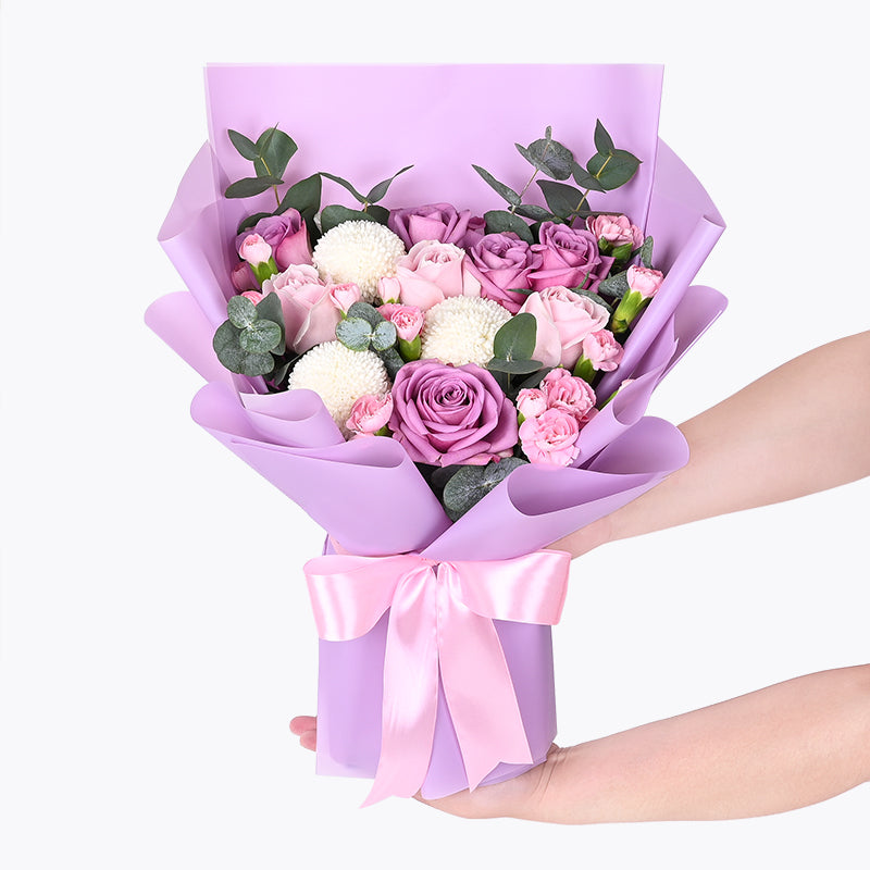Purple Roses (5 Stalks), Pink Roses (3 Stalks), White Ping Pong (3 Stalks), Light Pink Carnation Spray (2 Stalks), Eucalyptus Leaves