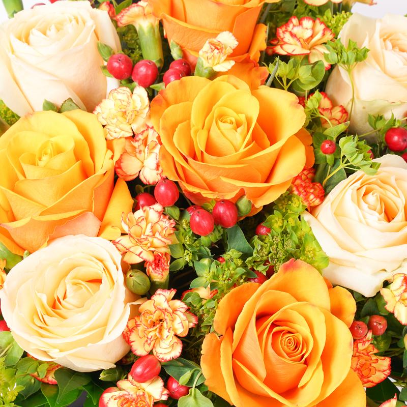 Champagne Rose (4 Stalks), Orange Rose (4 Stalks), Orange Carnation Spray (3 Stalks), Red Berry (2 Stalks), Green Buplerum