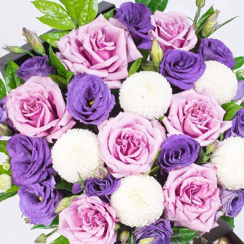 White Ping Pongs (5 Stalks), Purple Eustoma (3 Stalks), Purple Roses (7 Stalks)