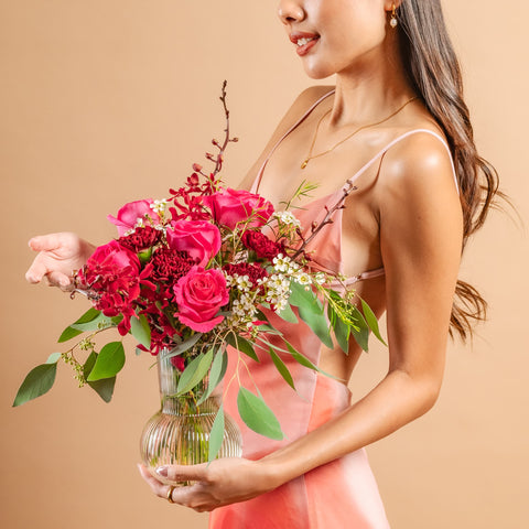 Shocking Pink Rose (5 Stalks), Maroon Carnation (3 Stalks), Red A Jones/James Story/ Friendship Orchid (1 Stalk), White Wax Flower (1 Stalk), Seeded Eucalyptus