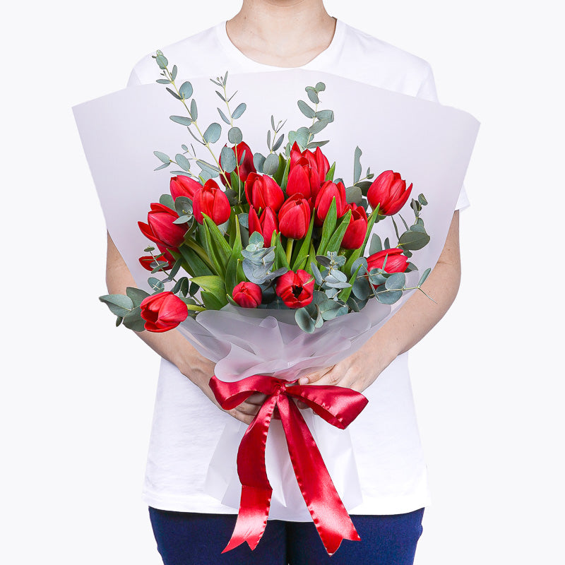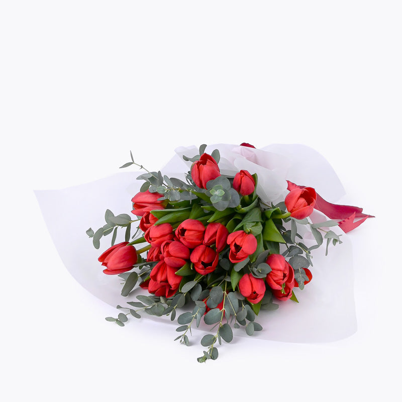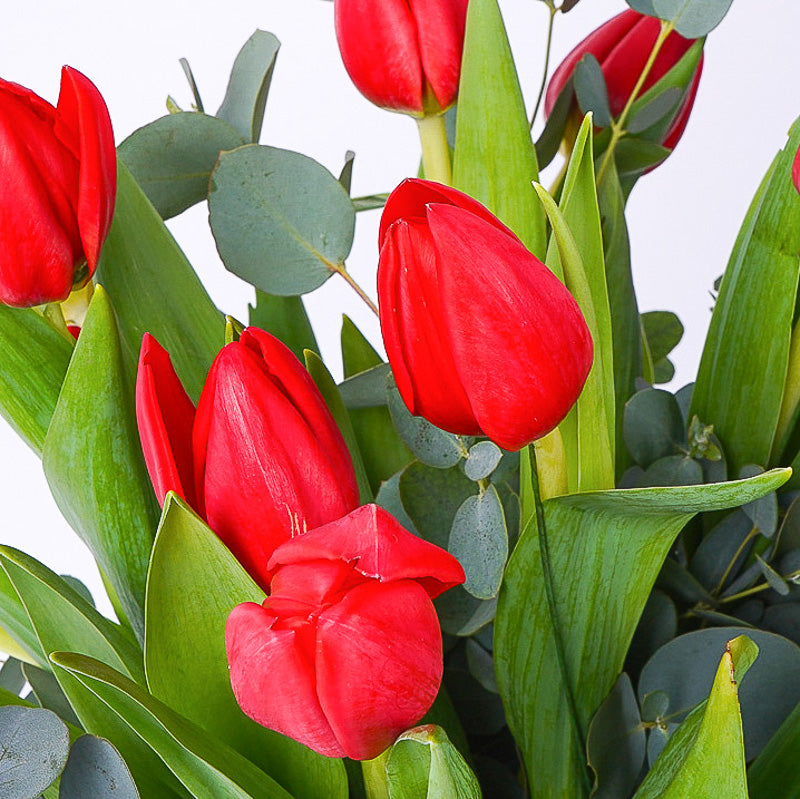 Red Tulip (20 Stalks), Eucalyptus Leaves