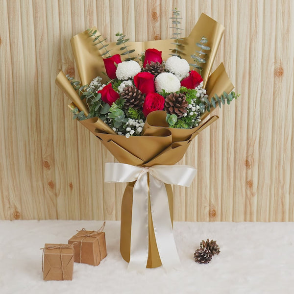Red Roses (6 Stalks), White Ping Pong (3 Stalks), White Baby Breath, Pine Cone (3 Stalks), Eucalyptus Leaves