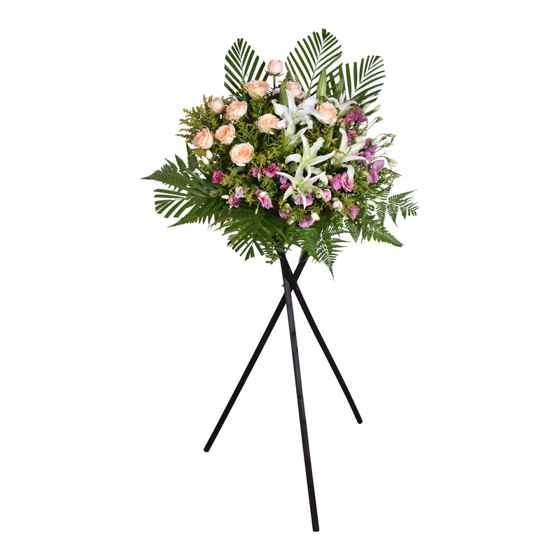 Pink Eustoma (5 stalks), White Lily (3 stalks), Champagne Rose (10 stalks), Green Palm Leaf, Yellow Peacock