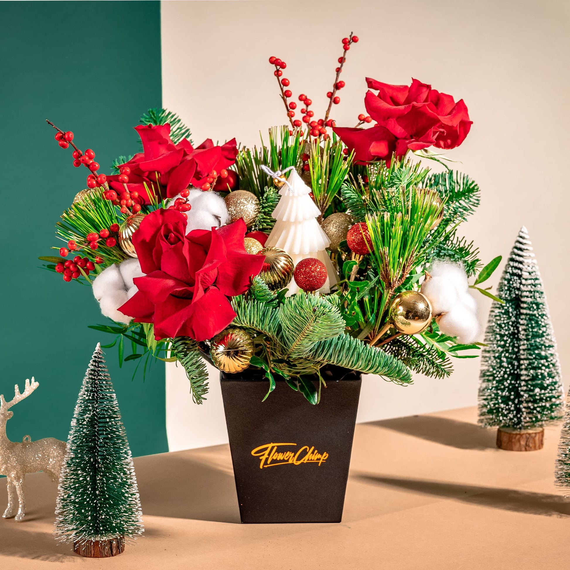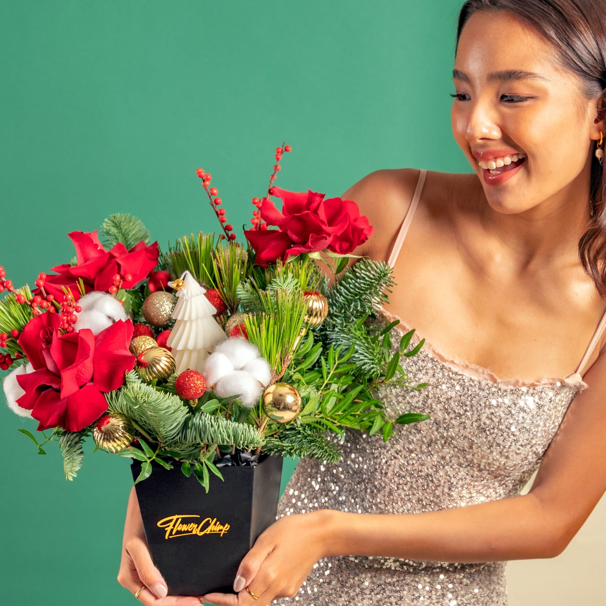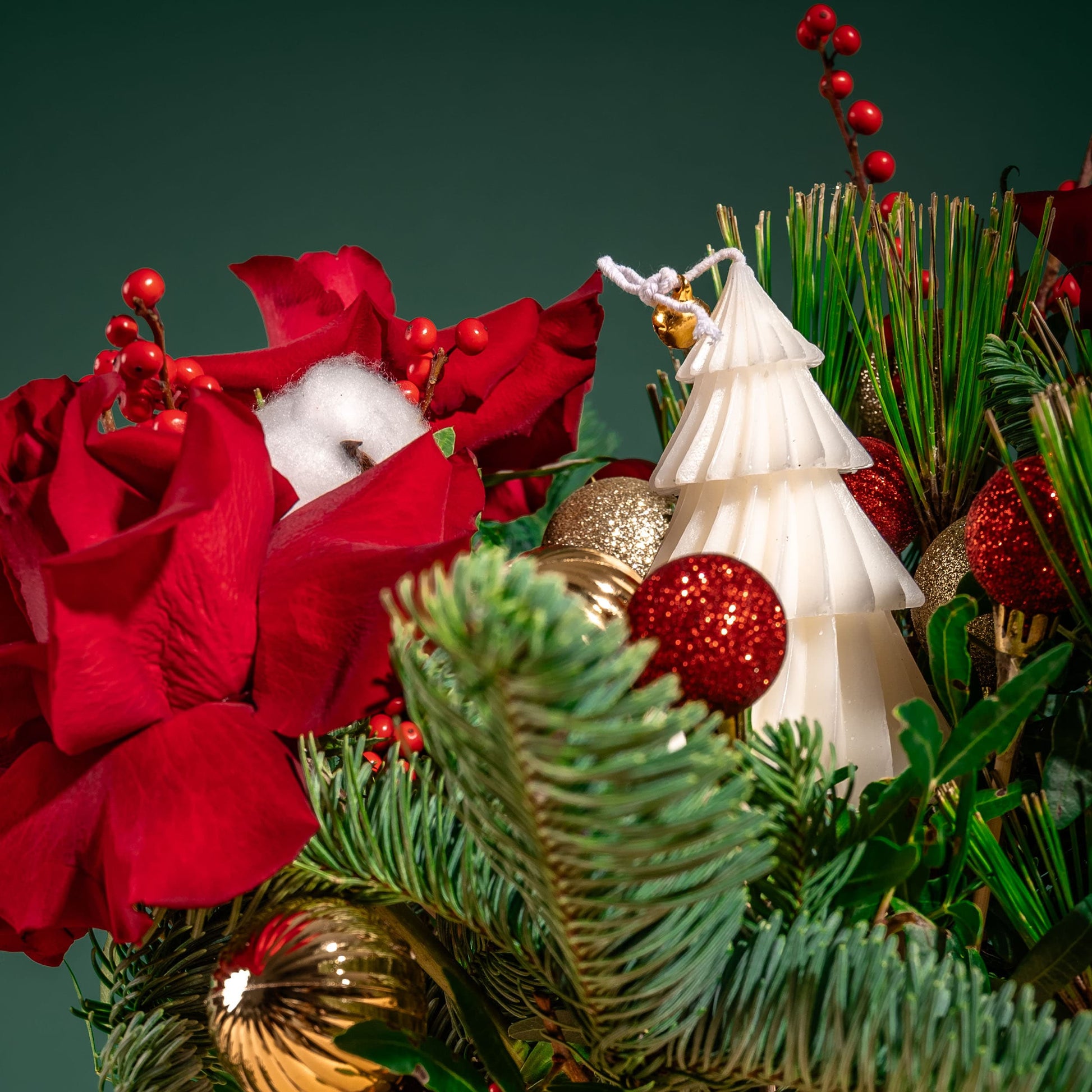 Celebrate the season with Winter Bloom — a lush, festive flower box that brings warmth and magic to any space. Vibrant red roses take center stage, surrounded by soft white cotton flowers, festive berries, and rich evergreen foliage. At its heart, a charming white Christmas tree candle casts a golden glow, nestled among radiant red and gold ornaments. Elegant, joyful, and full of holiday spirit, Winter Bloom is a timeless celebration of love, beauty, and Christmas cheer.
