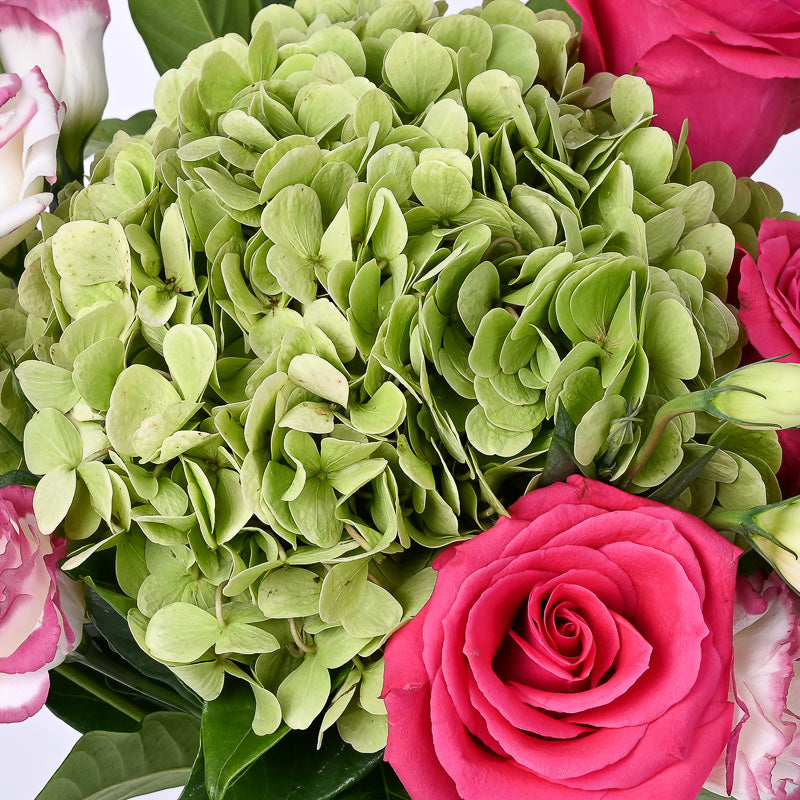Shocking Pink Rose (3 Stalks), Green Hydrangea (1 Stalk), Pink Eustoma (2 Stalks)
